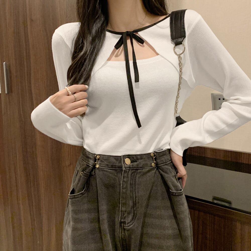 胸元カットトップス/長袖無地ニットソー/ニットインナー韓国