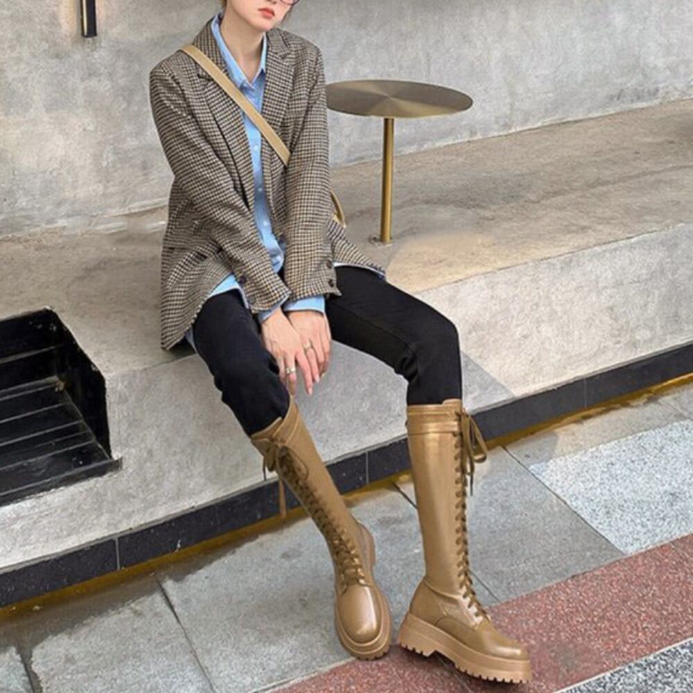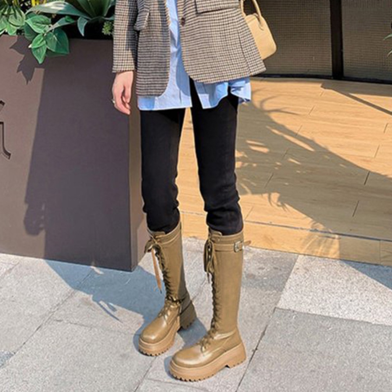 秋冬編み上げブーツ/おしゃれ 厚底冬靴/人気 膝下丈ブーツ